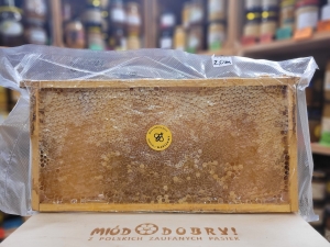Pochodzi z 2025 roku, z pasiek miejskich w Warszawie. Waga około 1,85 kg (brutto, netto przynajmniej1,5 kg). Wymiary zewnętrzne 36 x 18 cm.