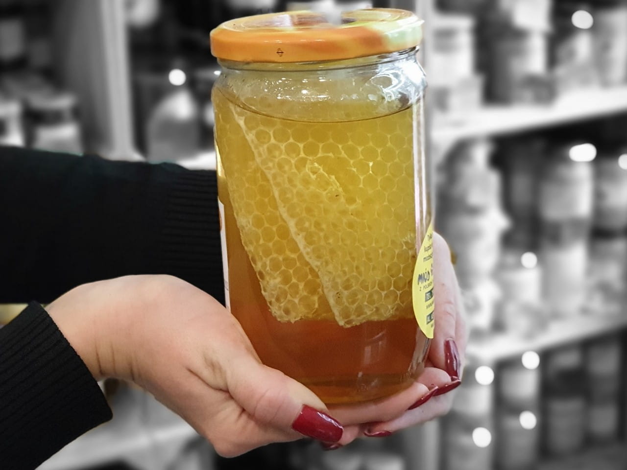 - Skład: 100% miód pszczeli naturalny, częściowo jeszcze w plastrze