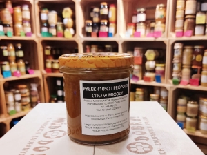 - Skład: miód pszczeli naturalny kremowany z 10% pyłku kwiatowego 1% propolisu