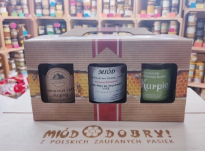 W skład zestawu wchodzą trzy wartościowe i wyraźnie różne w smaku, a przy tym klasyczne (nie smakujące tak inaczej, żeby istniało ryzyko, iż nie trafi się w gust osoby obdarowywanej) miody (z różnych zakątków Polski):