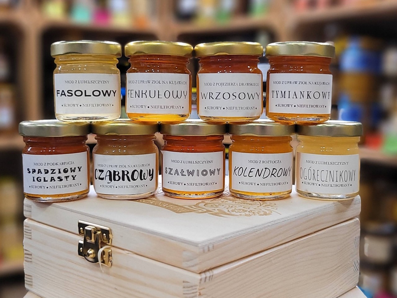 W tej Miodowej Bombonierce znajduje się dziewięć słoiczków 50g z drogimi rzadko spotykanymi surowymi miodami ze współpracujących z nami pasiek: