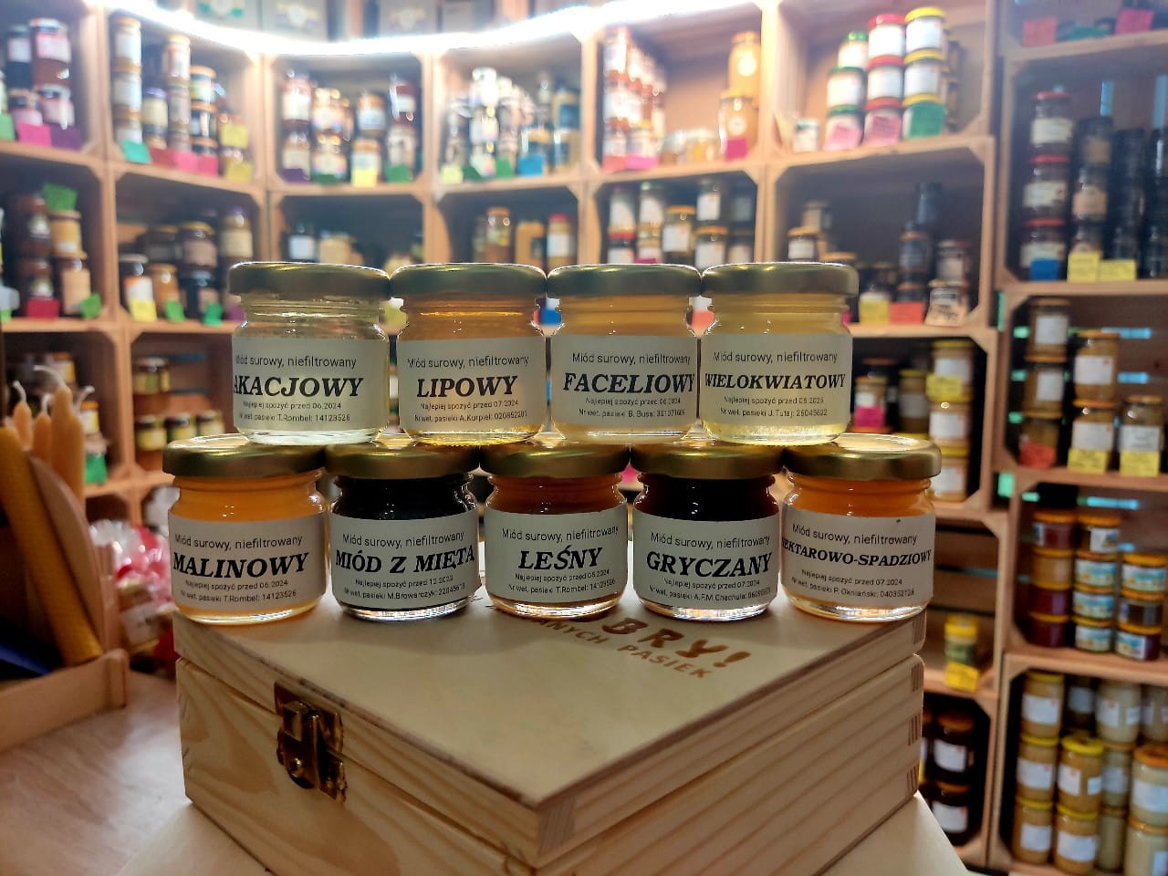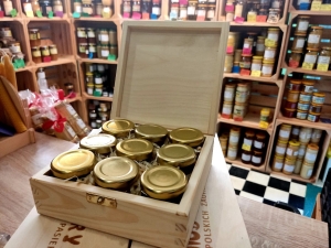 W Miodowej Bombonierce znajduje się dziewięć słoiczków 50g z surowymi miodami z różnych pasiek współpracujących z nami: